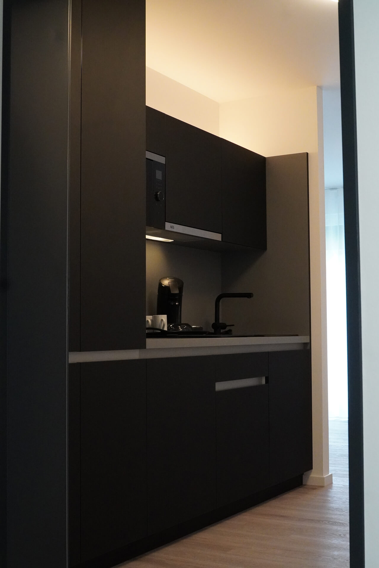 - Küchenzeile mit Kühlschrank, Mikrowelle, Kaffeepadmaschine und funktionelles Kücheninventar